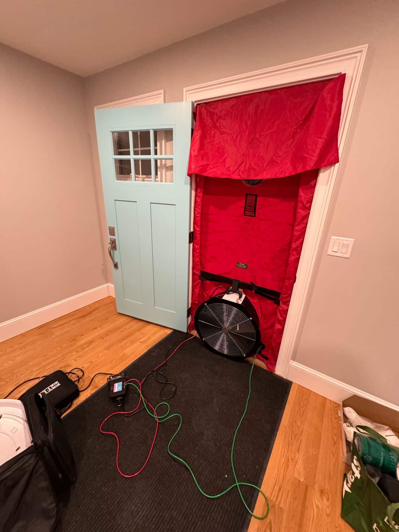 With the fan in place, we measure the air flow and determine the building’s air changes per hour (ACH). This metric is crucial for determining how airtight the home is and whether it meets local energy code requirements.